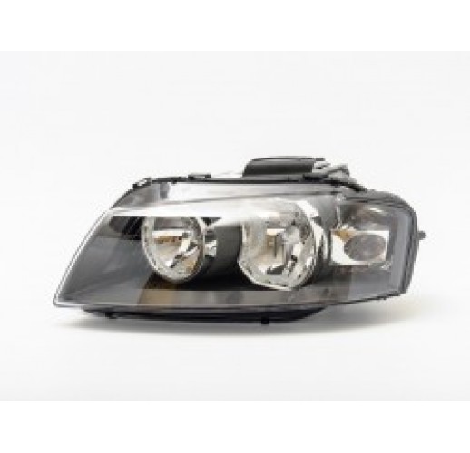 Kreisais priekšējais lukturis Audi A3 (2003–2008) ar H7/H7 spuldzēm un iebūvētu motoriņu lēcas regulēšanai. Augstākās kvalitātes oriģināls MARELLI ražojums.